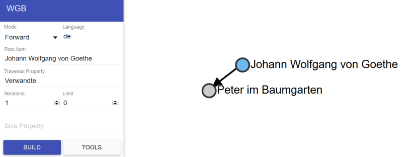 Und dann die Idee: Ah wäre ja auch mal eine schöne Übung, sehr schnell Stammbäume von Menschen zu erstellen. Wie so häufig war Goethe Ausgangspunkt der ersten Versuche. Kurz überlegt, die Abfrage müsste irgendwie „relative“, „Goethe“ und eine Angabe zur Iteration enthalten. Das passte nicht ganz, es gab nur ein Ergebnis, sehr enttäuschend. Aber was für ein Ergebnis: Peter im Baumgarten. Nie gehört.